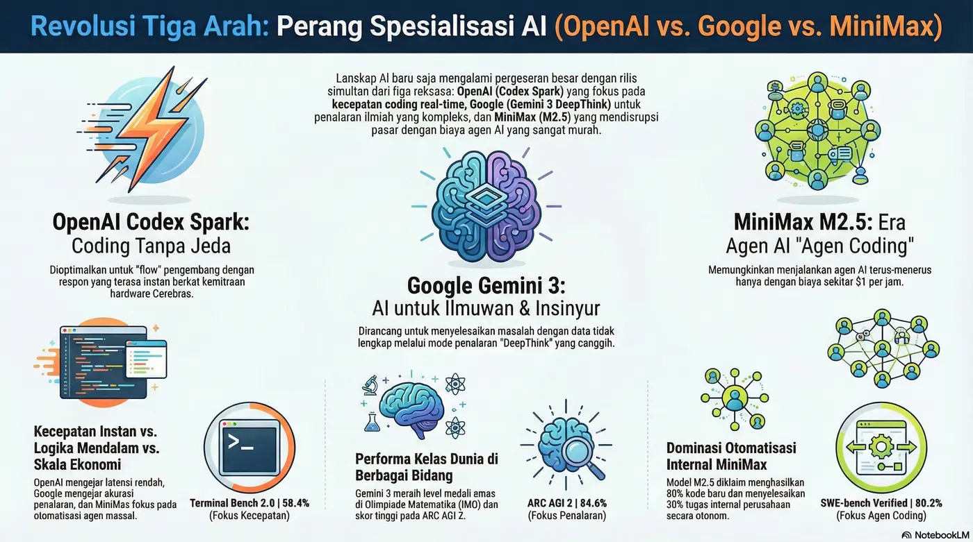 Dunia teknologi baru saja menyaksikan sebuah pergeseran paradigma yang langka. Dalam satu jendela waktu yang sangat sempit, tiga kekuatan besar—OpenAI, Google, dan MiniMax—meluncurkan pembaruan masif yang secara kolektif merobek aturan main lama dalam pengembangan perangkat lunak. Ini bukan sekadar iterasi produk; ini adalah disrupsi hulu-ke-hilir yang mengubah AI dari sekadar “chatbot pembantu” menjadi mesin penggerak otonom. Minggu ini menandai titik balik di mana kecepatan instan, penalaran mendalam, dan ekonomi agen bersatu untuk menciptakan era baru: era Always-On Software.