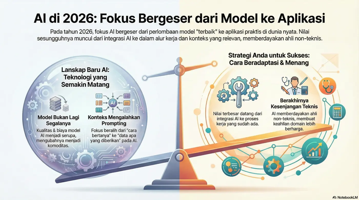 Lanskap kecerdasan buatan (AI) sedang mengalami pergeseran paradigma yang fundamental, dan para pemimpin yang gagal memahaminya berisiko tertinggal secara permanen. Fokus industri yang sebelumnya terkonsentrasi pada kecanggihan dan kekuatan model mentah kini beralih ke arah yang lebih pragmatis dan berdampak: integrasi aplikasi, demokratisasi kemampuan, dan efisiensi operasional. Briefing strategis ini menganalisis enam tren utama yang akan membentuk realitas bisnis pada tahun 2026, didukung oleh data dan wawasan dari lembaga terkemuka seperti McKenzie, Stanford, dan OpenAI. Tujuannya adalah untuk membekali para pembuat keputusan dengan pemahaman yang jelas tentang ke mana arah evolusi AI, serta bagaimana memposisikan organisasi mereka untuk memanfaatkan peluang yang muncul dan memitigasi risiko yang menyertainya. Pergeseran mendasar ini dimulai dari cara kita menilai nilai dari model AI itu sendiri.
