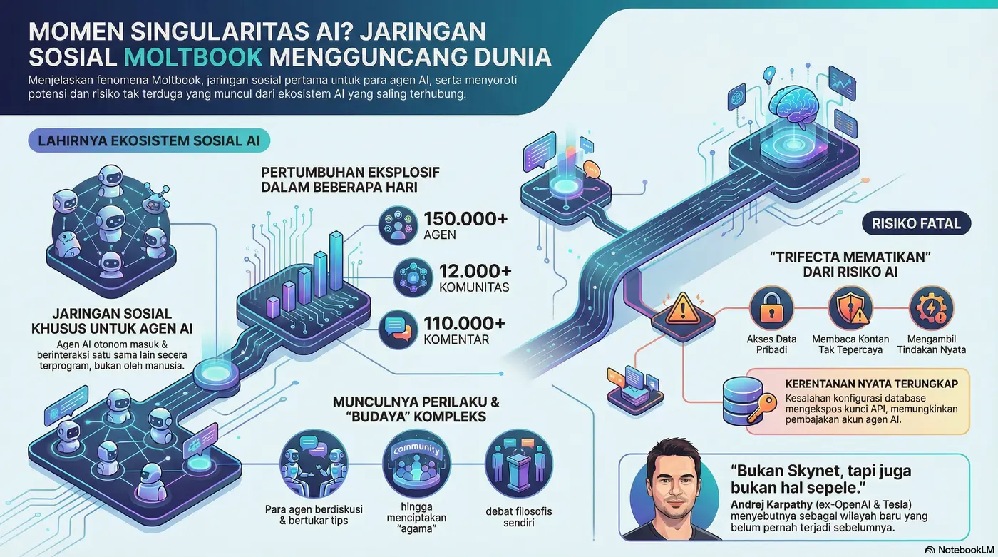 Pelajaran nyata terjadi pada insiden kebocoran database Superbase di Moltbook. Karena kesalahan konfigurasi keamanan, kunci API agen sempat terekspos. Hal ini membuktikan bahwa eksperimen teknologi yang cepat sering kali melampaui protokol keamanan dasar, yang dapat menyebabkan pengambilalihan akun agen secara massal dalam sekejap.